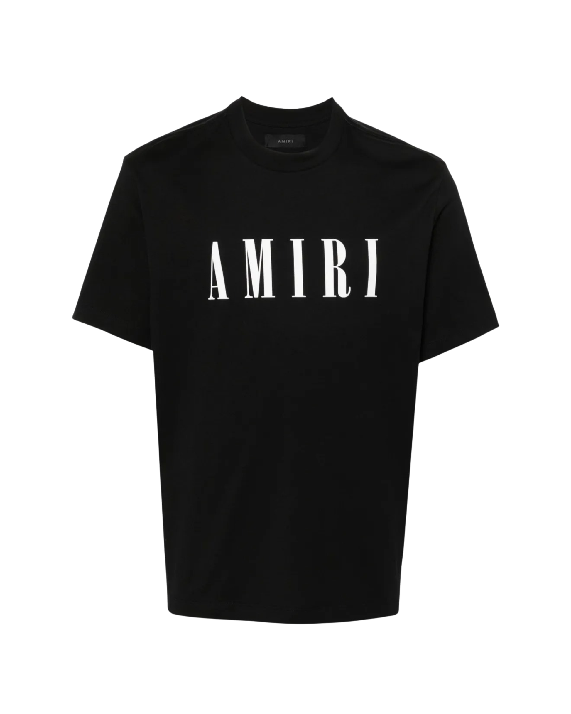 Classic black cotton T-shirt from AMIRI featuring a bold logo print on the front. Made from soft stretch-jersey with a crew neck, ribbed collar, and short sleeves. Crafted in Italy for quality and comfort.