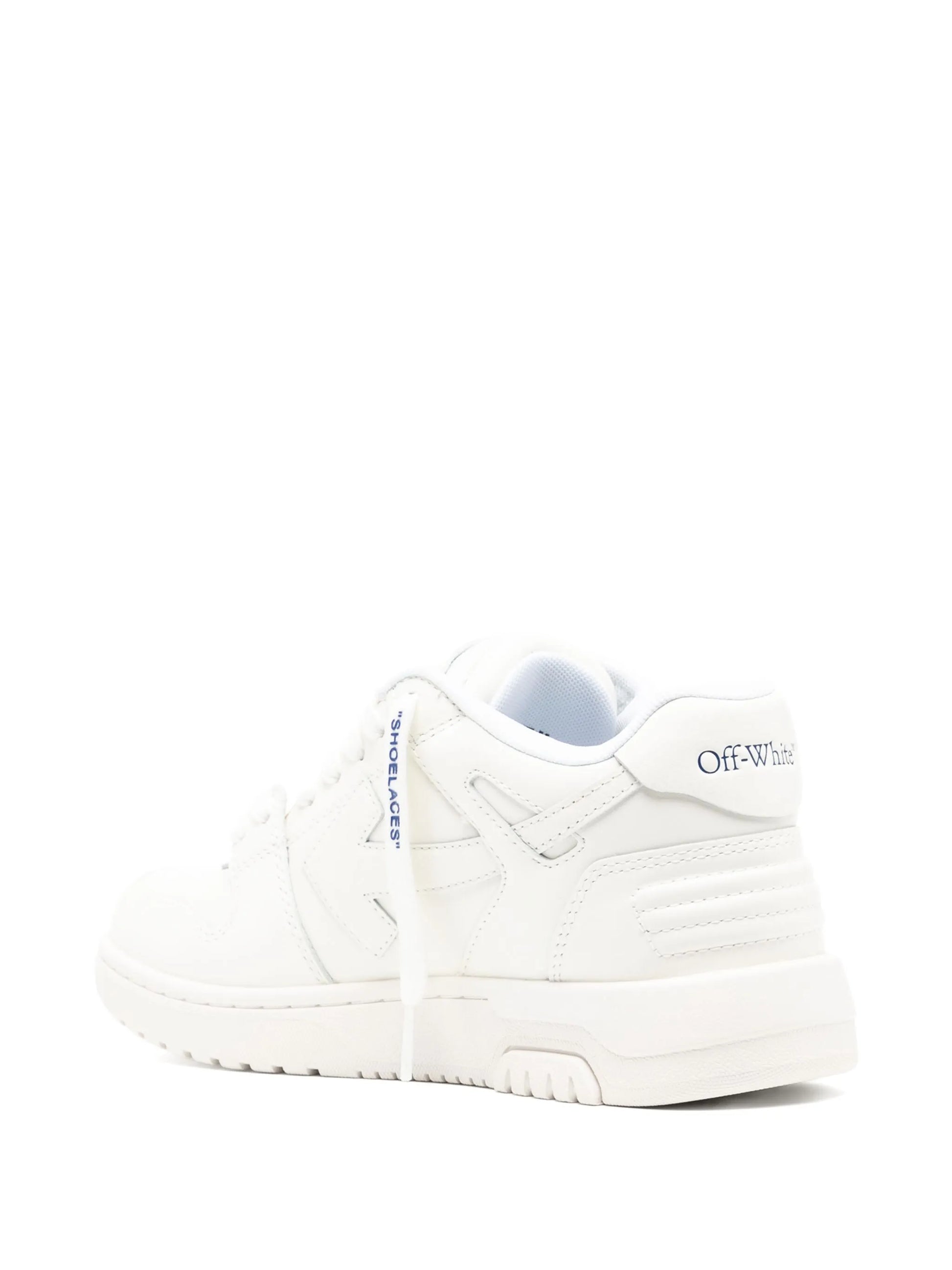 Off-White Out Of Office trainers in white and navy feature premium calf leather with mesh details, a signature Arrows design, and a comfortable flat rubber sole. Perfect for stylish, everyday wear.